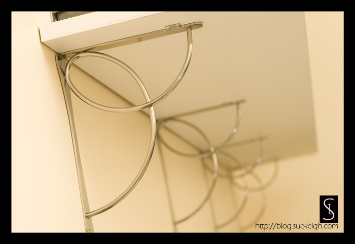 Gary has been hanging shelving in the house all day today (now that we are out of floor space for furniture) and it looks so great! We now have shelving in both offices and the master bedroom which looks so great, holds a lot of stuff, and looks even better than we thought. I love the brackets he picked out!