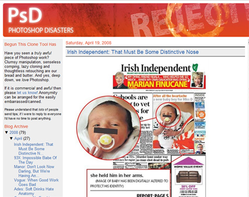 Sites like these are fun! I found this site earlier today, and went through every single page. One of my favourites was in a Victoria’s Secret catalogue of a hand left on the shoulder of the model but no one was standing next to her. Check out the Photoshop Disasters Blog, not everyone is perfect or as skinny as they look in the magazines 🙂