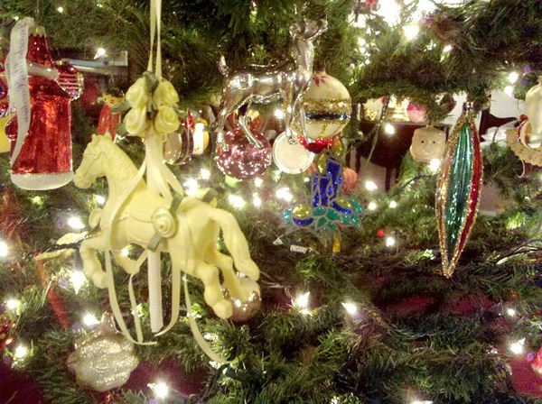 My mom made some of the ornaments, like the little carousel horse you see, and some of the ornaments are replica old fasioned ornaments that I love too.