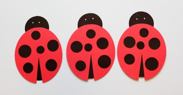 I did make these adorable lady bugs today. Fairly easy . . . red ovals with slits cut out, the head and body attached to each other on one piece of black paper, circles of varying sizes for the backs, and some metal rhinestone like pieces for the eyes. I was going to make antenna’s but didn’t want them to get damaged or ripped when someone pulled it out of the envelope.