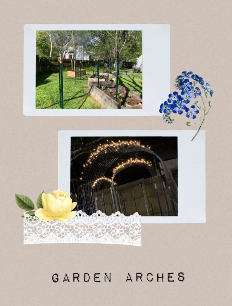 I’m a big fan of mood lighting and twinkly lights, so I got some solar wire lights and added them to the tops of my arches. It took a bit of waiting to see which way they should face for the most effective sun exposure, but they light up and actually last until about 1 or 2 A.M.